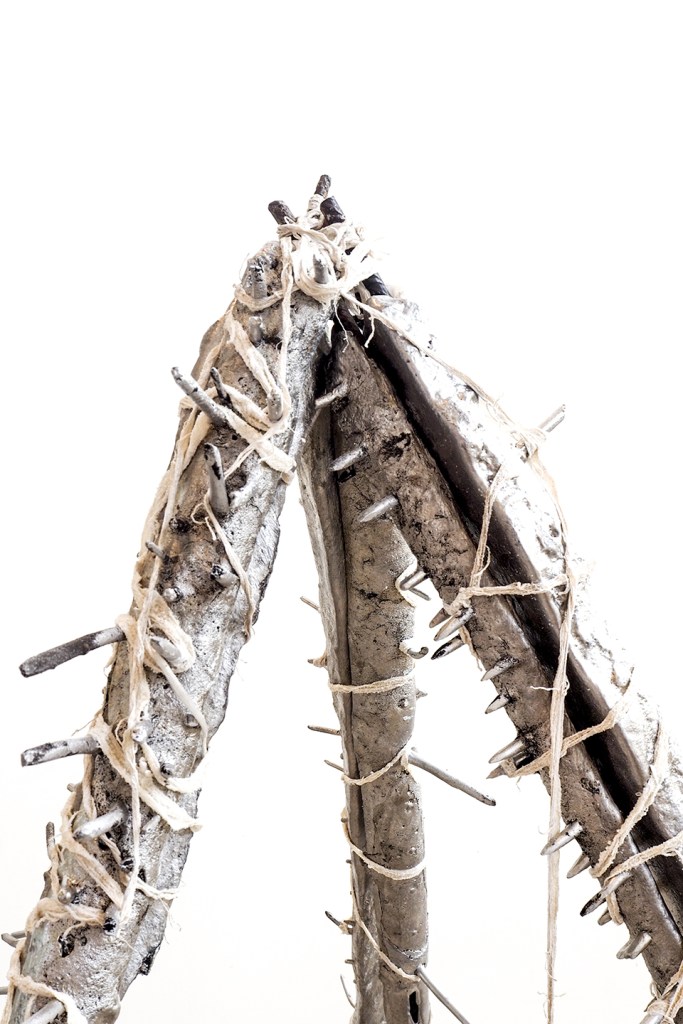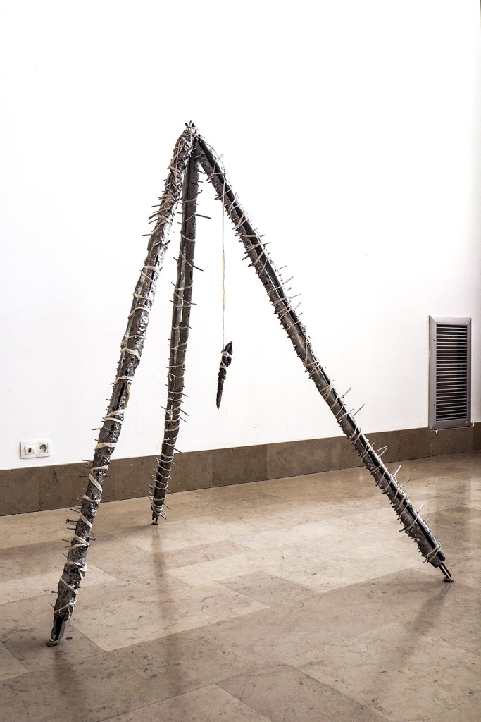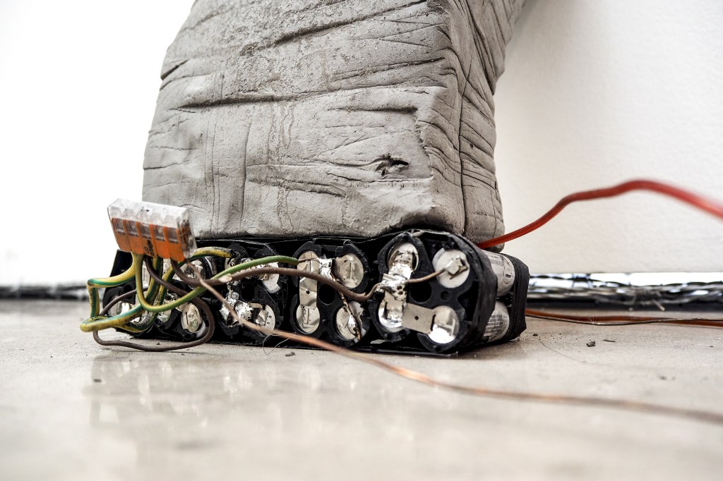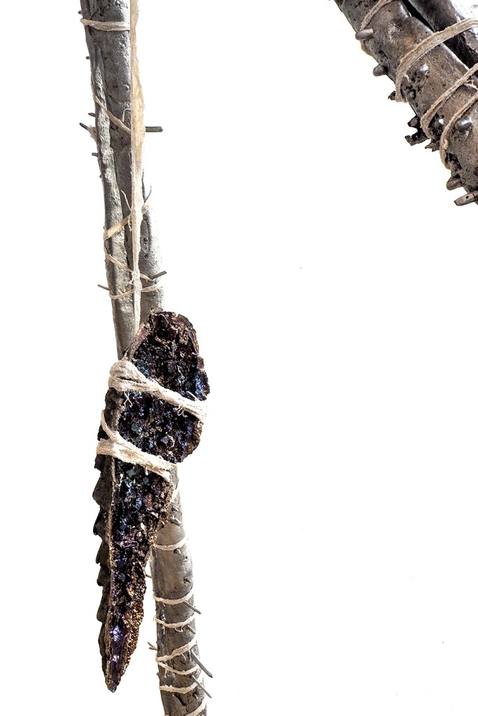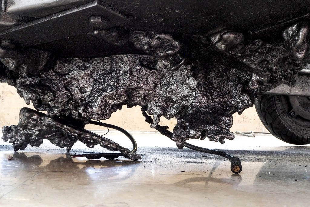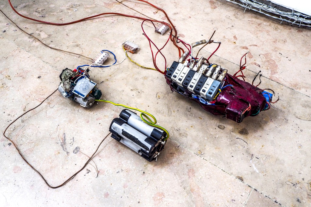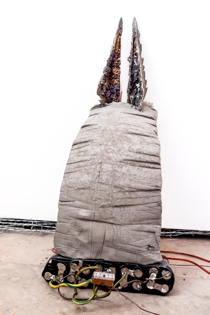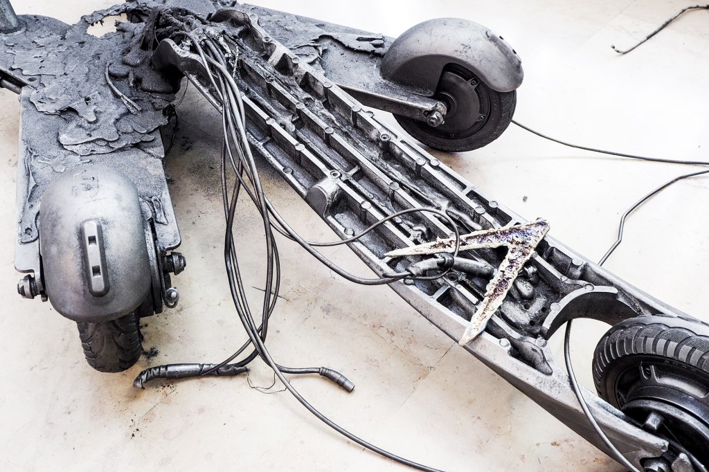 Installation made with: lime scooters, AQ 18650 lithium batteries, bismuth crystals, melted aluminum, porc intestines, napalm inspired homemade resin, inks, toner, barbed wire, burned-by-both-ends match.