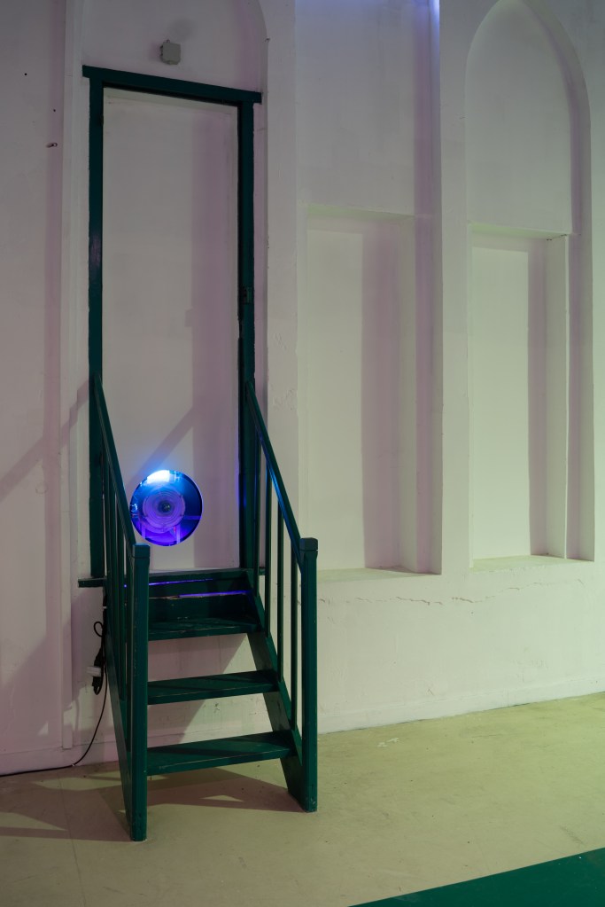 oreilles, pour mieux faire passer les pulsations du lieu dans son propre corps. Les infrabasses soufflées par les pâles et le rotor qu’il a minutieusement montés l’un aux autres font vibrer le lieu et remuer ses spectres. Ce sont peut-être à eux que sont dédiées les larmes recueillies dans les lacrymatoires- « mignonettes » en savon d’Andréa Le Guellec. Visqueuses, translucides, les minuscules cruches qui accompagnaient autrefois les âmes défuntes vers l’au-delà rappellent ici les vitraux lointains et les yeux qui ont regardé à travers eux. Dans la flaque savonneuse s’unissent en puissance les larmes d’hier et d’aujourd’hui, individuelles et collectives, dans une tentative de réactivation d’un rite funéraire perdu mais ô combien réconfortant. Il y a quelque chose de magique dans les objets, trucs et choses qui nous entourent. Une faculté à relier les histoires selon l’appropriation qui en est faite et le milieu dans lequel ils circulent. L’objet capture et conserve, rend compte du monde et induit ses mouvements. Ainsi de la radio-pirate de Julie Gaubert, dont les ondes invisibles, magnifiées par les monumentales antennes hérissées dans l’espace, court-circuitent les canaux d’informations habituels. Un petit émetteur aura donc suffi à imposer une nouvelle voix et remplacer les chaînes d’information en continu par les poèmes composés par l’artiste. Jolie promesse contenue en un si discret outil. Comme de celle renfermée par le capteur de pression atmosphérique qui sert au passeur avec lequel a travaillé Ghyzlène Boukaila à traverser les frontières maritimes qui séparent l’Europe de l’Afrique. Sur le radeau au large de la baie d’Alger, il est un phare et une boussole dans les mains du harraga. Élément déclencheur d’un nouveau chapitre de l’histoire individuelle, il aide à maintenir le cap au milieu de l’horizon infini. D’outil de mesure à pack de sauvetage, la translation aisée de l’objet d’un registre à l’autre révèle son infini pouvoir narratif. C’est sur lui enfin que Paul Ralu compte pour résoudre l’énigme qu’il a montée de carton-pâte et d’Agfamatic vintage. Les mini appareils de capture d’image que les enfants des années 1980 pouvaient trouver dans leurs paquets de céréales sont des jouets et des vestiges d’une histoire des techniques dont les objets eux-mêmes écrivent tous les chapitres.