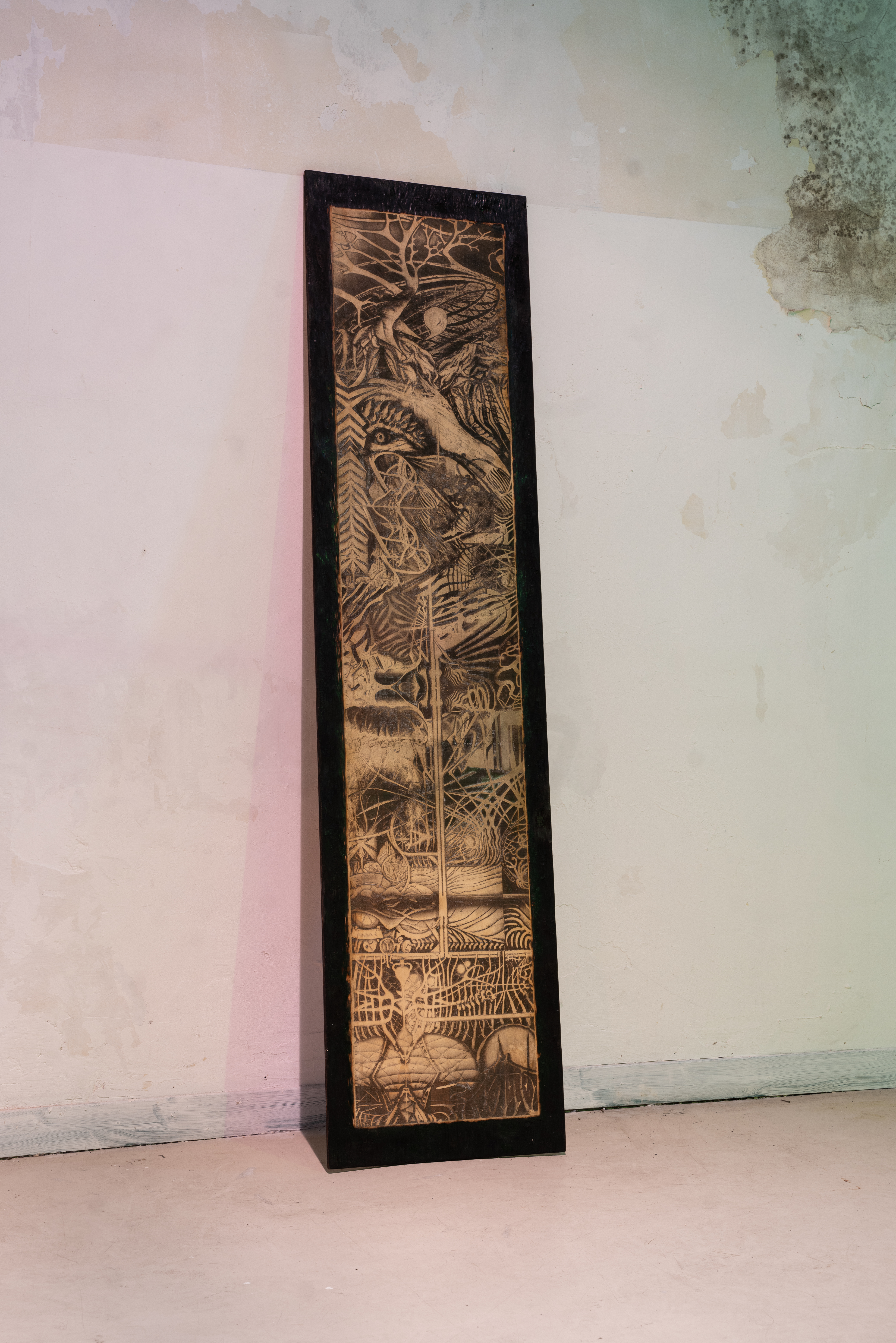 Il était une fois une antenne radio gigantesque, un appareil photo vintage, un rotor d’hélicoptère, un capteur de pression atmosphérique, une fourmilière, un plafonnier et un lacrymatoire devenus les exergues d’autant d’histoires rapportées par les sept artistes réunis à Saisons Zéro. Caché dans le seuil d’une porte, lovés dans les alcôves vertigineuses, pointant haut vers le ciel et ses ondes, perçant les murs ou les surmontant, coulant sur le sol ou voguant sur les flots, ils sont venus faire converger ensemble les récits de vie des quatre artistes résidents du couvent (Ghyzlène Boukaila, Wilfried Dsainbayonne, Julie Gaubert et Paul Ralu) et de leurs trois invités (Flora Aussant, Andréa Le Guellec et Victor Villafagne). Des invitations, une résidence et un atelier partagé auront suffi à entériner la rencontre. Dis-moi quel objet tu montres, il nous dira qui tu es. À travers les choses rapportées, montées, moulées, bricolées, édifiées et transfigurées par chacun des artistes, les chemins de vie se tissent et se rejoignent d’un bout à l’autre de l’ancien gymnase. Sous la gigantesque charpente, ils ont remplacé les corps des écoliers du début du siècle, qui eux-mêmes avaient succédé à ceux des sœurs Clarisses, les premières arrivées dans le quartier. Au milieu des fantômes qui flottent dans l’architecture médiévale, par-dessus les sédimentations que les différentes vies du lieu ont imprimées sur les murs, ils sont venus abriter de nouvelles voix et proposer d’autres entrelacs. Alors, l’histoire de métissage suggérée par Wilfried Dsainbayonne, qui a rapporté du salon de la maison lilloise familiale le lustre sous lequel il a grandi avant de l’hybrider avec des calebasses venues de plus loin – fusion d’une double culture qui déborde littéralement les murs dans laquelle on voudrait l’enfermer –, résonne avec celle d’abri que tissent les assemblages composés par Flora Aussant. Ses pseudo-fourmilières en forme de maison d’enfant faites en portes de meubles de cuisine rassurent comme un foyer en même temps qu’elles inquiètent comme un labyrinthe. Comment faire sienne la maison habitée lorsqu’elle est dessinée par d’autres ?En explorant ses fondations et ce qui la travaille à l’intérieur, dans le secret des planches de bois centenaires, nous dit Victor Villafagne. Dans l’entrebâillement discret de la mystérieuse porte au fond de l’espace, la machine qu’il a bricolée invite à fermer les yeux et ouvrir ses